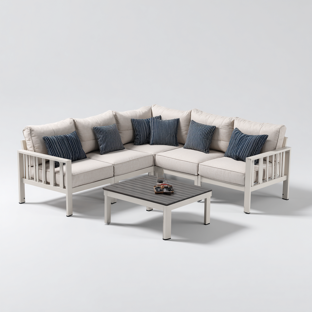 Questo divano da esterno è pensato per arredare spazi outdoor come terrazze e giardini con un'estetica sobria e funzionale. La disposizione angolare crea una zona relax ben proporzionata, adatta all'utilizzo quotidiano all'aperto.