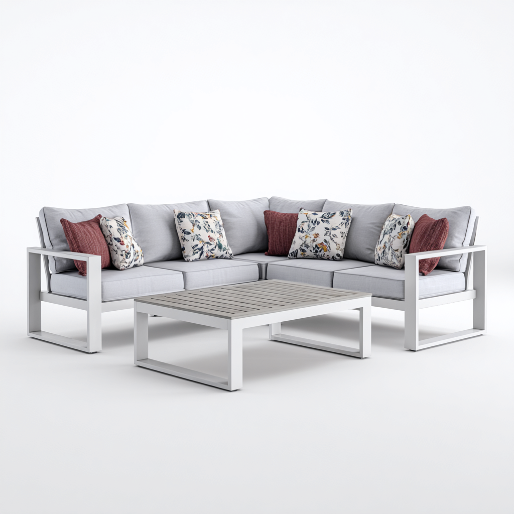Questo divano da esterno è progettato per arredare terrazze e giardini con uno stile pulito e contemporaneo. La composizione angolare offre una seduta ampia e ben distribuita, ideale per momenti di relax e convivialità all'aperto.