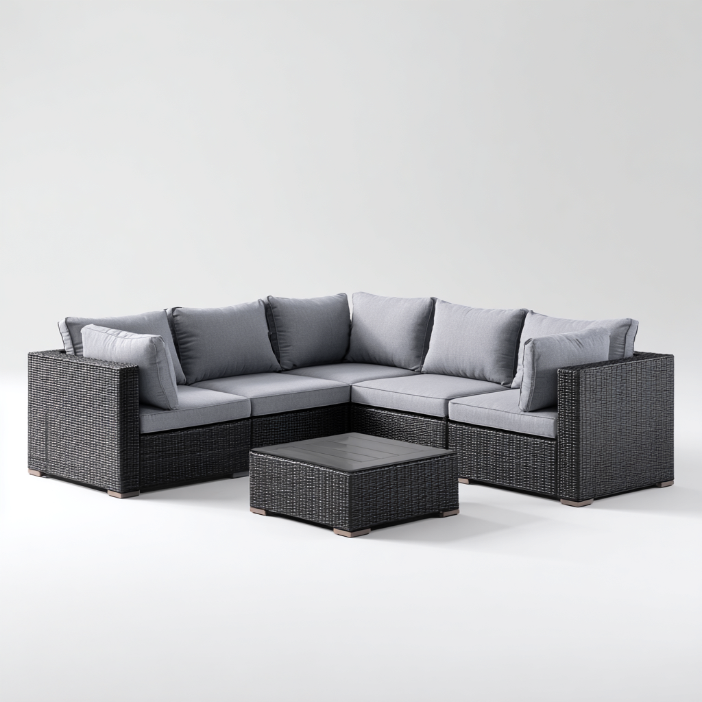 Questo divano da esterno è progettato per arredare spazi outdoor come giardini e terrazze offrendo una seduta compatta e ben bilanciata. La disposizione angolare consente di creare un'area relax ordinata e funzionale, adatta all'uso quotidiano.